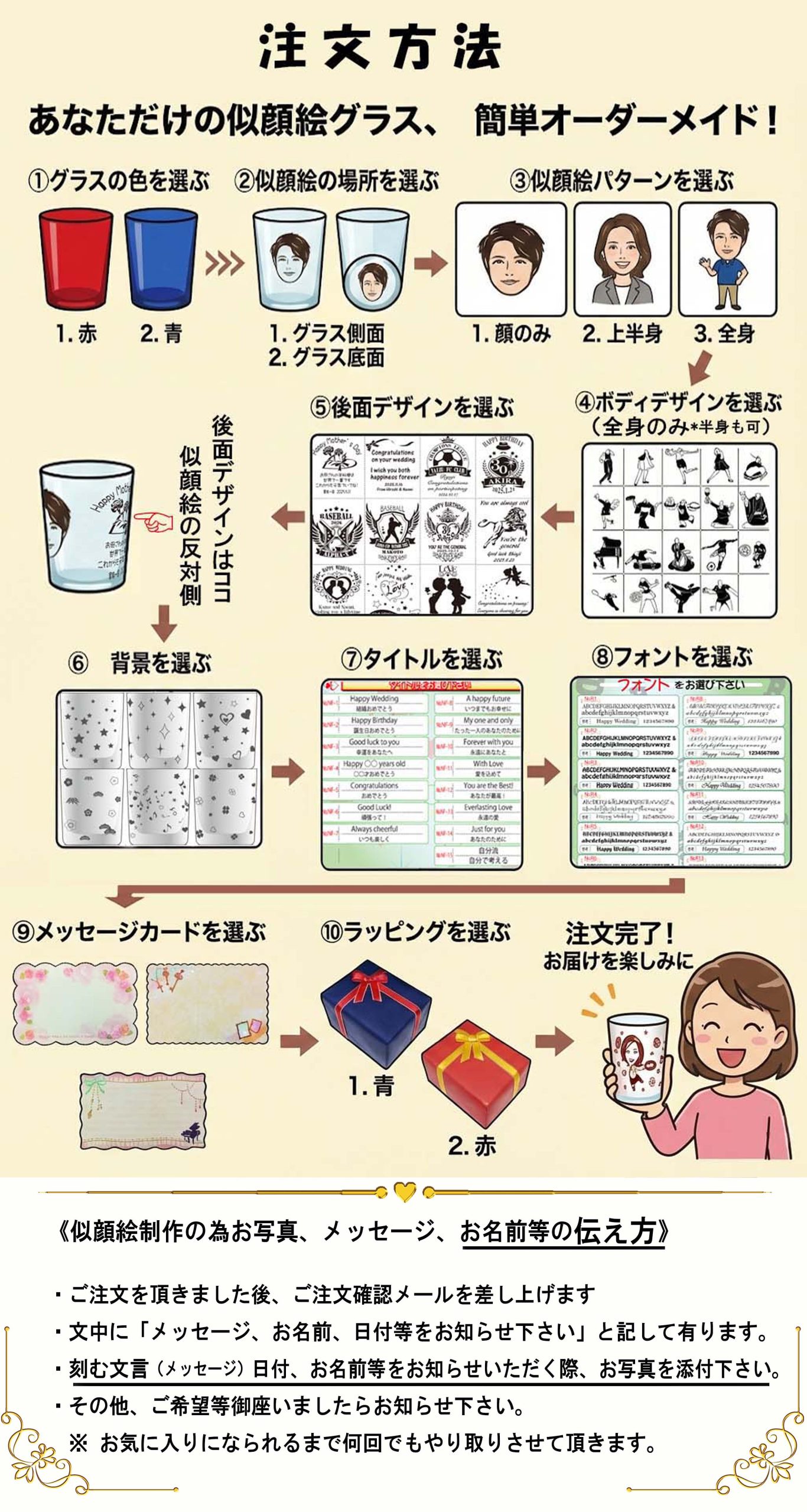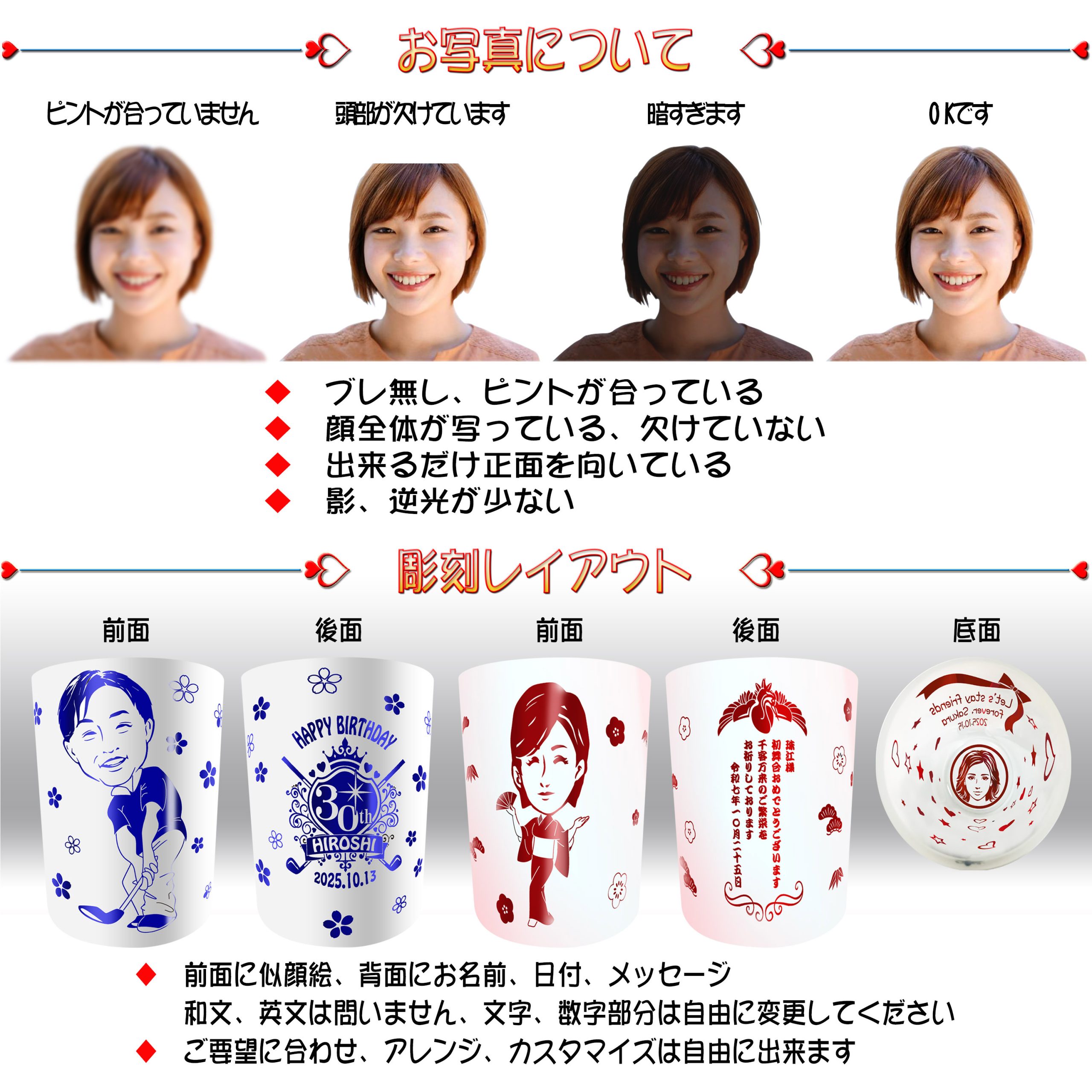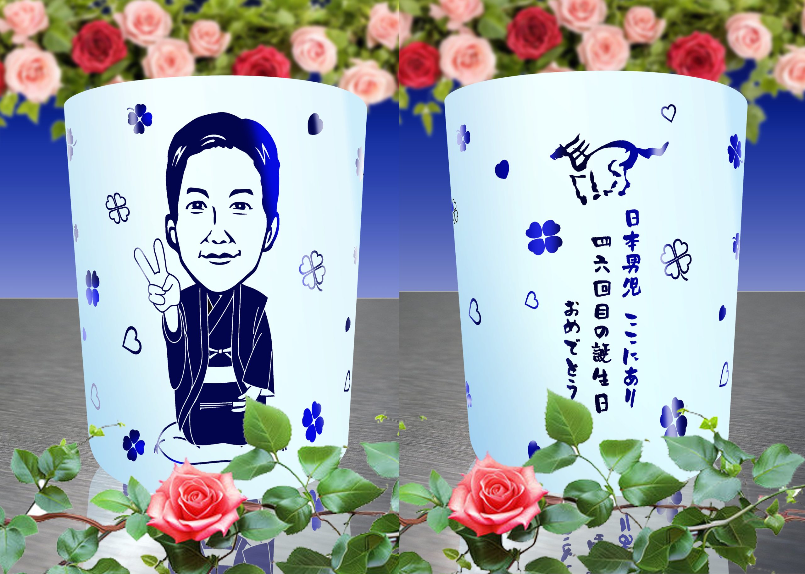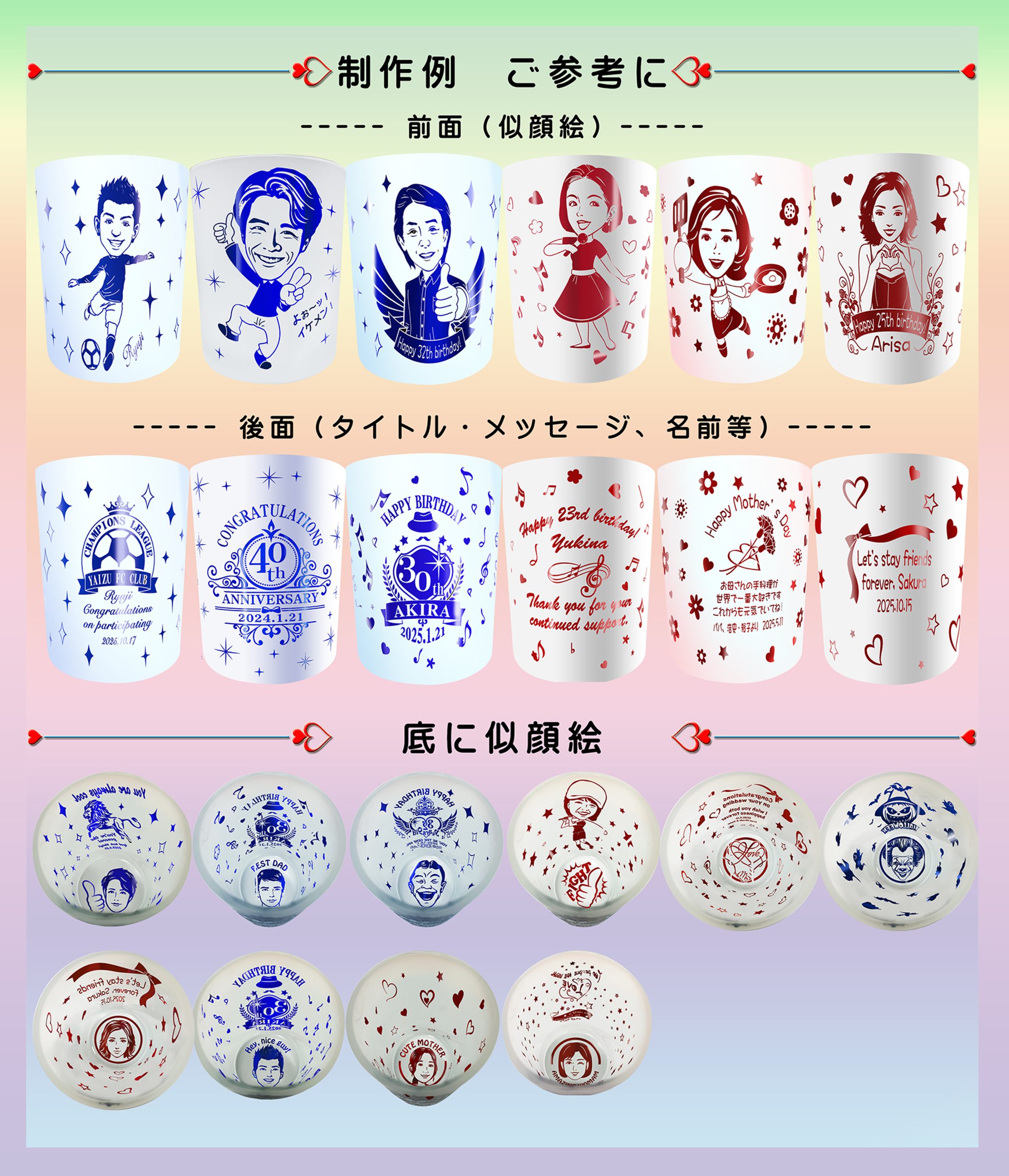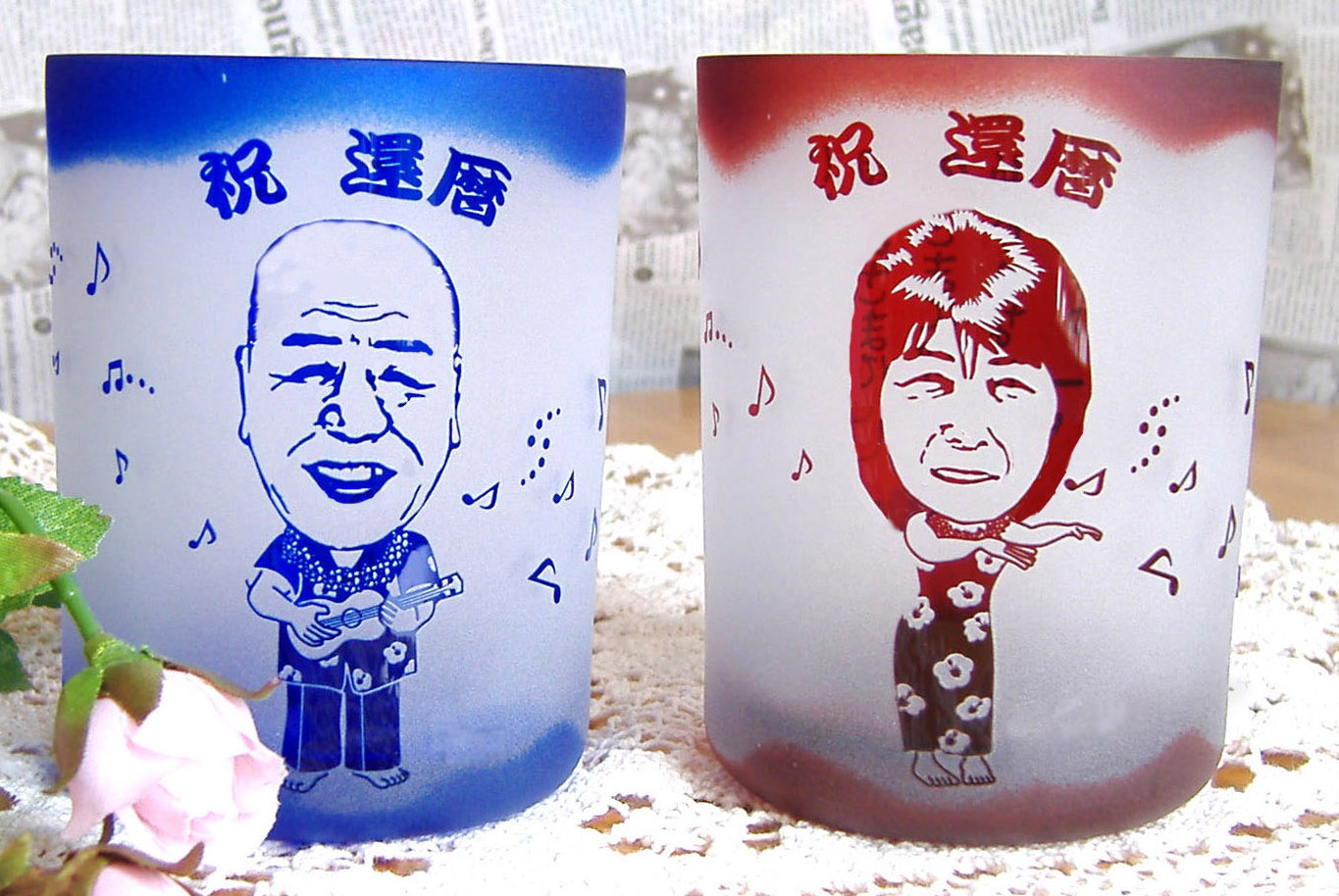 長寿(還暦等)、結婚、退職、誕生日等にのお祝いにピッタリの似顔絵グラス。